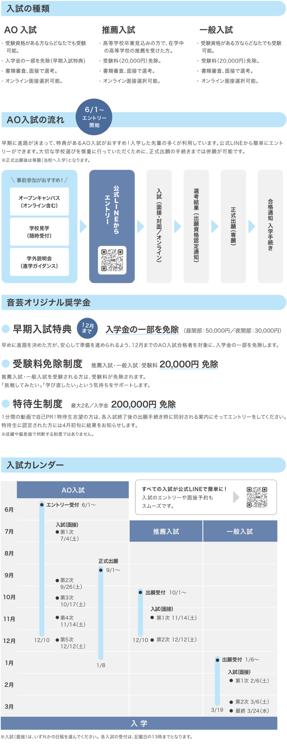 学校紹介 2027年度 / 入試・特待生ガイド 音芸は、成績や偏差値よりも今の気持ちや興味を大切にしています。入試は面接のみ(対面またはオンライン)。入試のエントリーは、LINEやwebからスムーズです。 詳細はこちらをご覧ください。